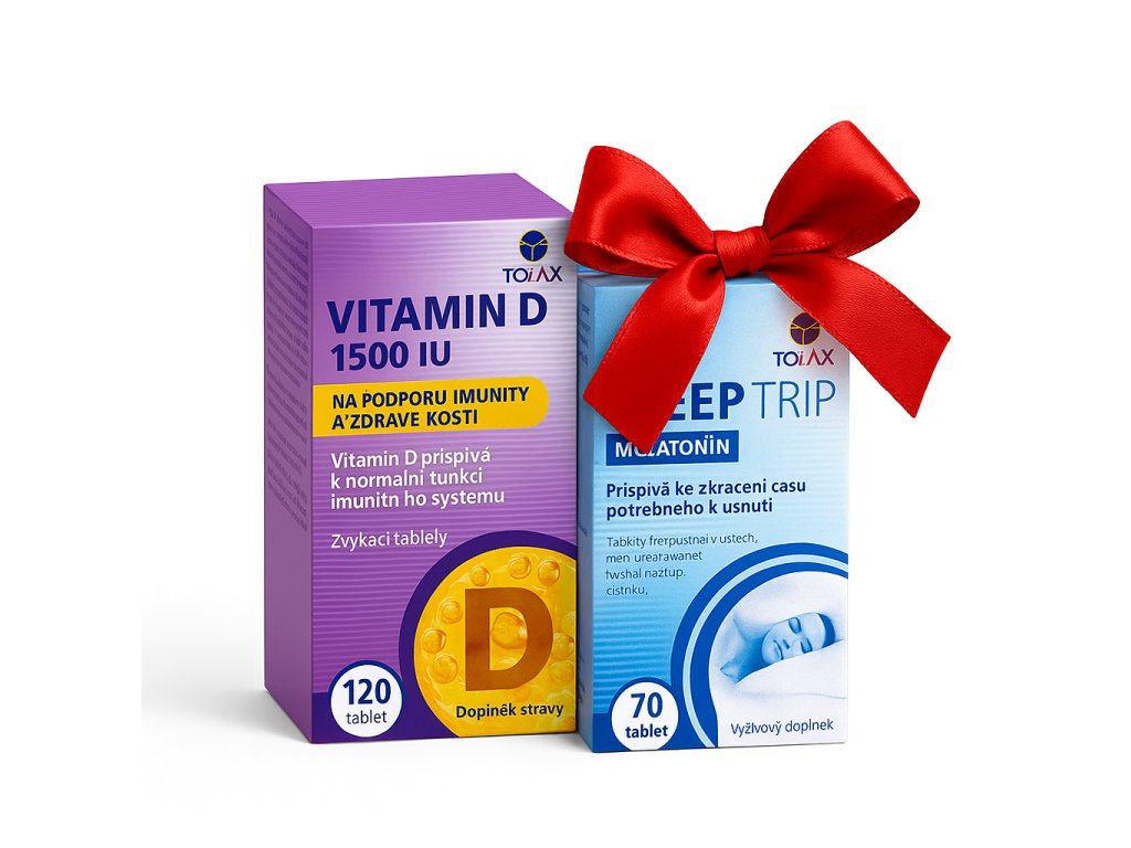 Vánoční balíček ZDRAVÝ SPÁNEK od TOZAX – ideální dárek pro klidné noci a regeneraci. Kombinace doplňků Sleep Trip a Vitaminu D podporuje zdravý spánek a celkovou pohodu.